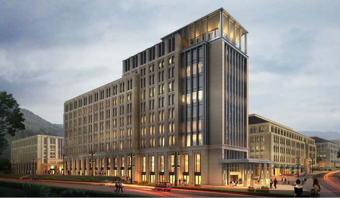 本項目位于重慶兩江新區(qū)龍盛片區(qū)總部基地中區(qū)、南區(qū)。用地面積55633.7m2,容積率1.5,建筑密度40%,綠地率30%。用地性質為其他商務用地。本工程地上部分由十棟板樓,一棟點樓構成。建筑以新古典主義風格統(tǒng)制全局。以精到的比例、精致的細部賦予建筑以氣質;以架空、錯動、退臺等手法賦予建筑以表情。建筑表皮以花崗巖石材、高級外墻涂料等搭配使用,使建筑群體高檔而不失之于呆板。